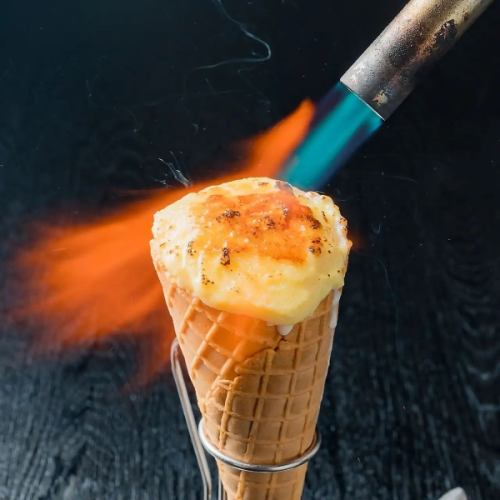 当店では〆のデザートまでこだわっています。自家製のカタラーナや自家製のプリンなど竹内養鶏場の白い卵・十勝加藤牧場のジャージー牛ミルクを使用したデザートメニューをご提供。お客様の目の前で仕上げる「炎のブリュレソフト」はSNS映えも抜群◎